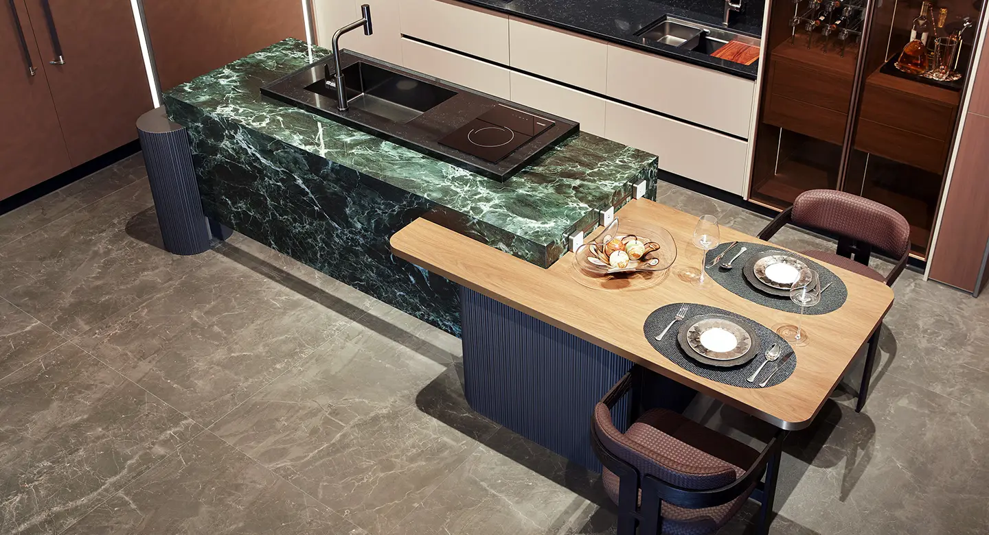 Ever dreamed of a kitchen that feels both luxurious and warmly inviting? This earth-toned kitchen with its stunning green island brings that dream to life, combining natural materials with sophisticated design for a space that’s as functional as it is beautiful.