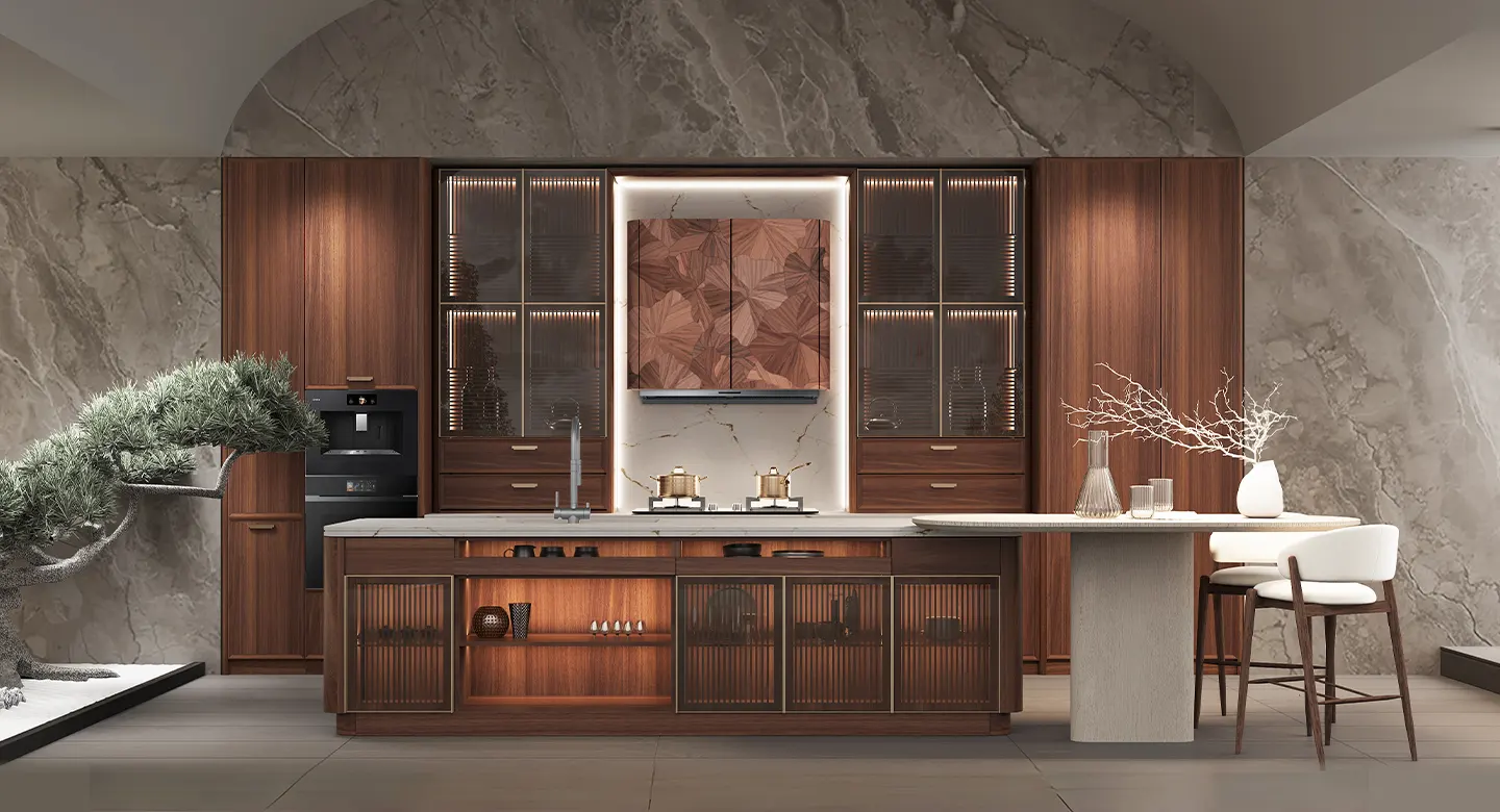 The straight grain walnut cabinets serve as the heart of this kitchen system, offering rich, natural warmth that complements the sleek modern UV lacquered surfaces. This intentional material contrast creates a balanced harmony that epitomizes sophisticated design. The traditional grid pattern pays homage to Eastern architectural principles while maintaining a distinctly contemporary appeal.